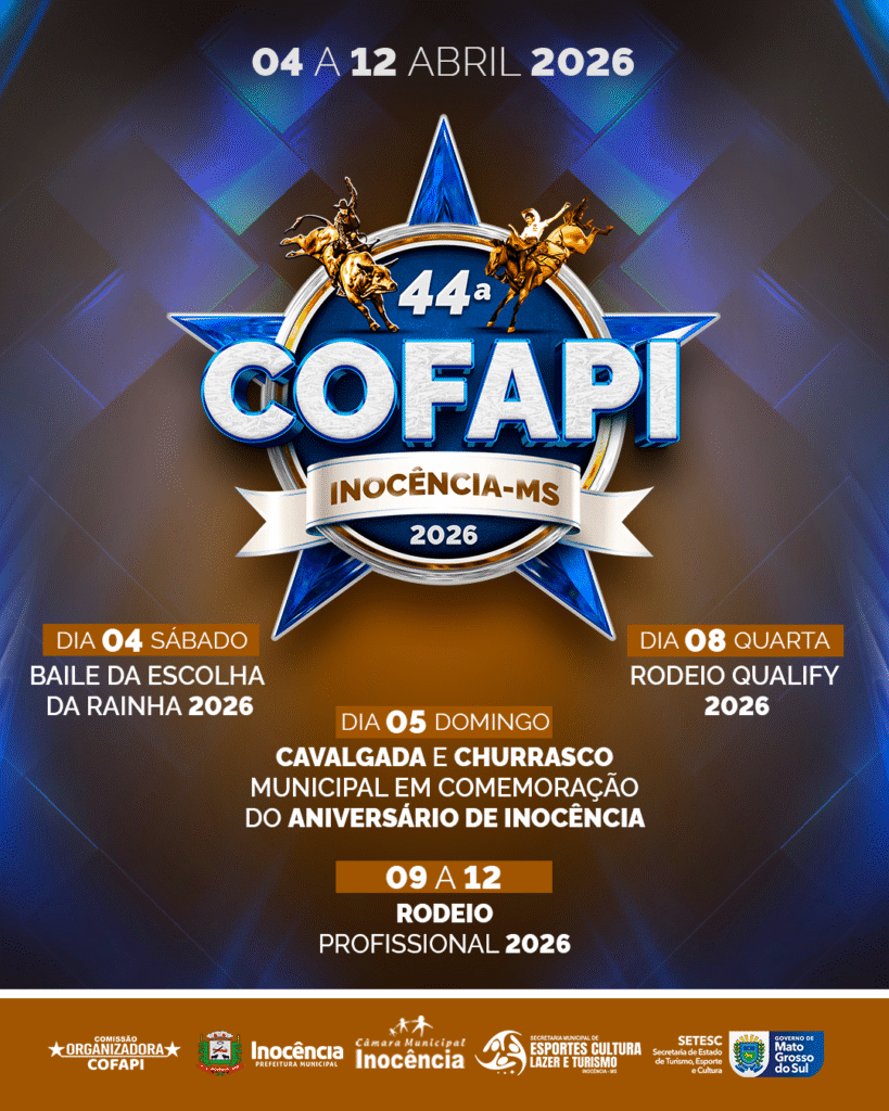 A Comissão Organizadora da Festa do Peão de Inocência (COFAPI) realizará a 44ª Festa do Peão, entre os dias 8 e 12 de abril, com apoio da Prefeitura Municipal, Câmara Municipal, Governo do Estado, SETESC (Secretaria do Turismo, Esporte e Cultura) e da senadora Soraya Thronicke.